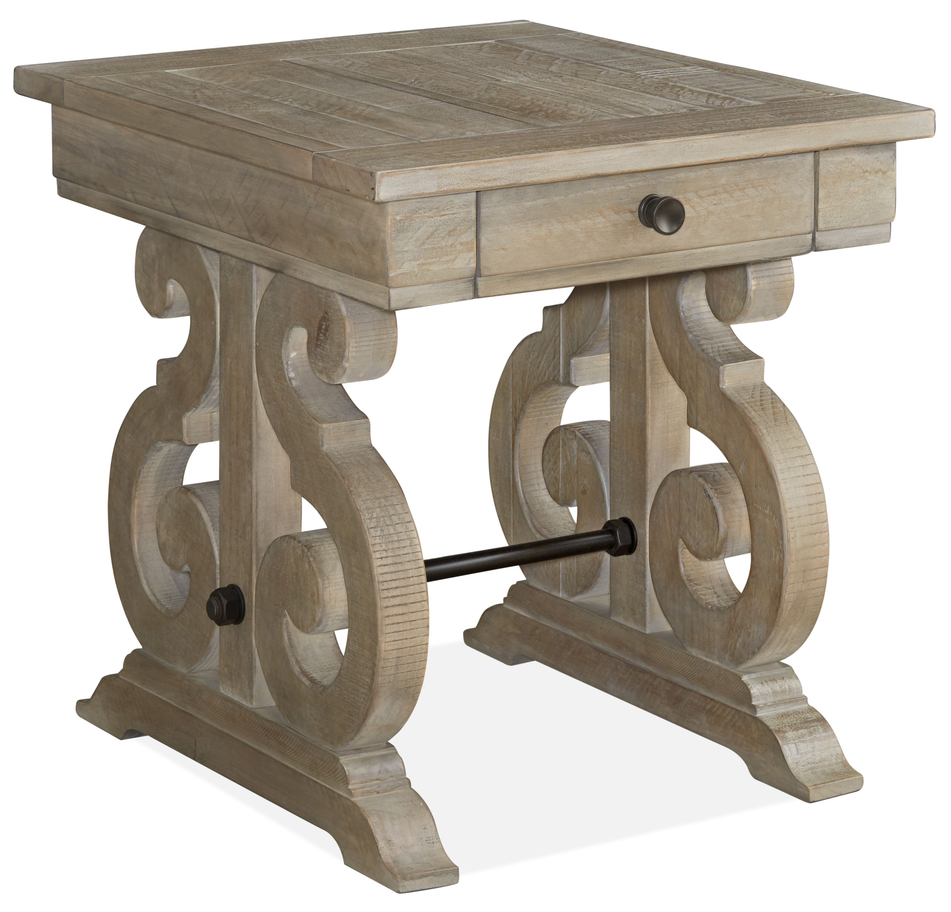 Bring Old World charm home with the Tinley Park table collection. Gracious S-curved carved bases support overlaid solid pine tops finished in vintage inspired Dovetail grey on pine.
